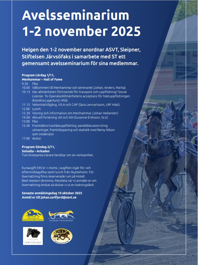 Avelsseminarium 2025 arrangeras 1-2 november på Menhammar och Solvalla.